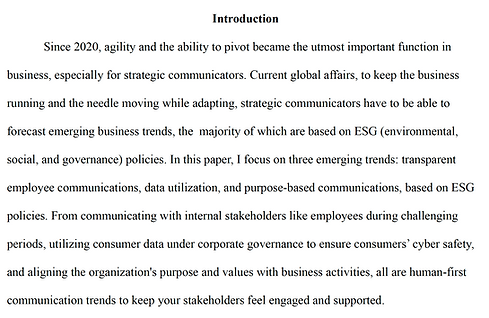 This is the trends and ideas assignment for PRAD 564 - Business Skills for Strategic Communicators class. As aspiring communicators, we are tasked to identify the top trends in business and society for corporate leadership members. I focused on three upcoming trends in communications: transparent employee communications, consumer data utilization, and purpose-based communication.